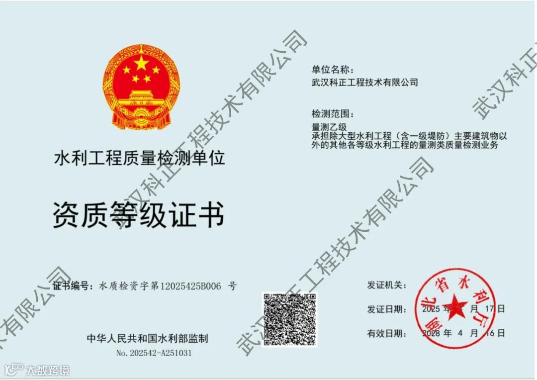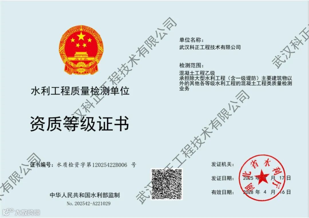 近日,经湖北省水利厅核准,武汉科正工程技术有限公司成功斩获水利工程质量检测四项乙级资质(混凝土工程、金属结构、量测、岩土工程)。这一重要突破,标志着在建筑工程检测领域深耕二十余年的科正公司,正式进军水利工程检测新赛道,实现战略版图的重大升级。