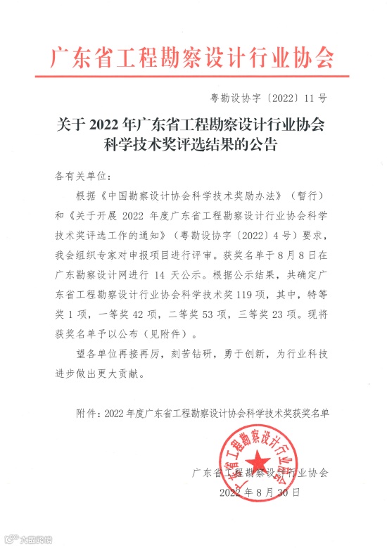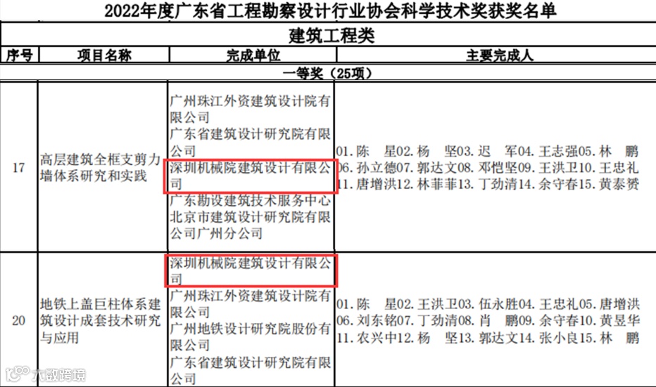 近日,广东省工程勘察设计行业协会颁发了《关于2022年广东省工程勘察设计行业协会科学技术奖评选结果的公告》。根据结果公示,深圳机械院(以下简称“公司”)作为“高层建筑全框支剪力墙体系研究和实践”、“地铁上盖巨柱体系建筑设计成套技术研究与应用”项目的参与完成单位之一,荣获“2022年度广东省工程勘察设计行业协会科学技术奖”(以下简称“省设协科技奖”)一等奖两项。