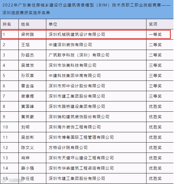8月28日,由深圳市住房建设局指导,深圳市勘察设计行业协会、深圳市装饰行业协会联合主办,深圳市特区建工职业技能培训学校承办,深圳市建筑业协会、深圳市建筑信息模型产业促进会共同支持的2022年广东省住房城乡建设行业建筑信息模型(BIM)技术员职工职业技能竞赛--深圳选拔赛在深圳市特区建工培训学校成功举办。公司建筑数字化中心梁树路以选手身份代表深圳机械院参加了比赛。