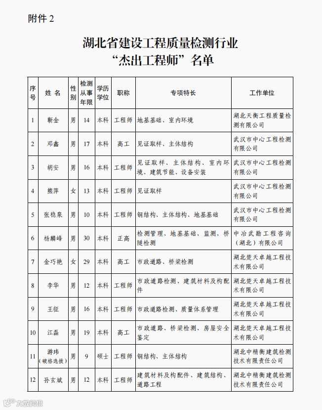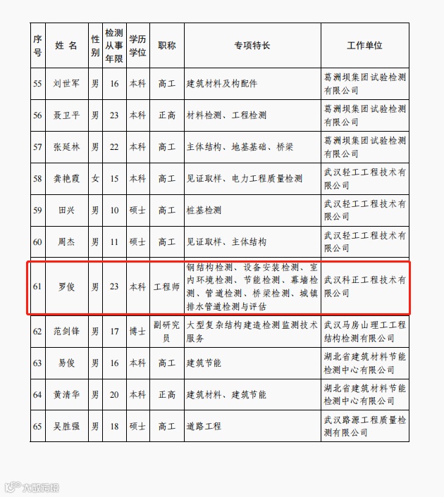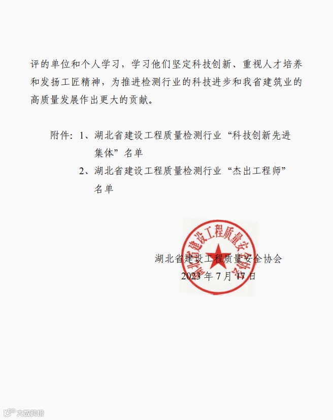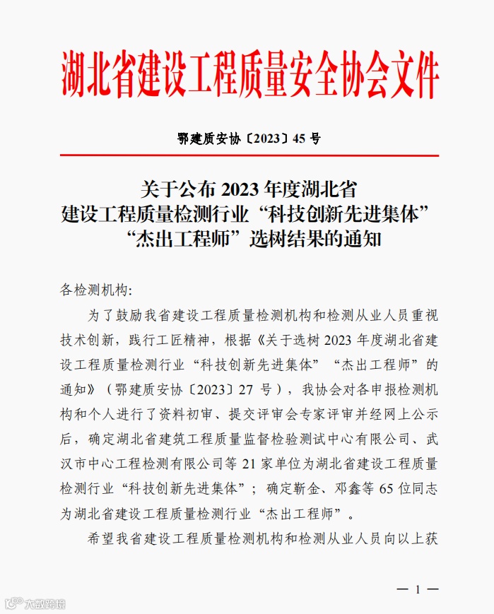 公司先后通过了“质量、环境、职业健康、诚信”四体系认证,连续多年获得由湖北省科学技术厅、湖北省财政局和国家税务总局湖北省税务局联合颁发的“高新技术企业”证书;由武汉市洪山区科学技术与经济信息化局颁发的“2022年度瞪羚企业”证书;由湖北省建设工程质量安全协会颁发的“湖北省建设工程质量检测信用等级AAA”证书;由武汉建筑业协会颁发的“武汉市最具成长性民营建筑企业”和“理事单位”同时,我司是武汉建筑业协会建筑检测分会单位,被评为武汉市房屋鉴定协会“先进单位”、“武汉建筑工程质量检测五星级单位”、“武汉建筑业信用企业等级AAA”等荣誉。