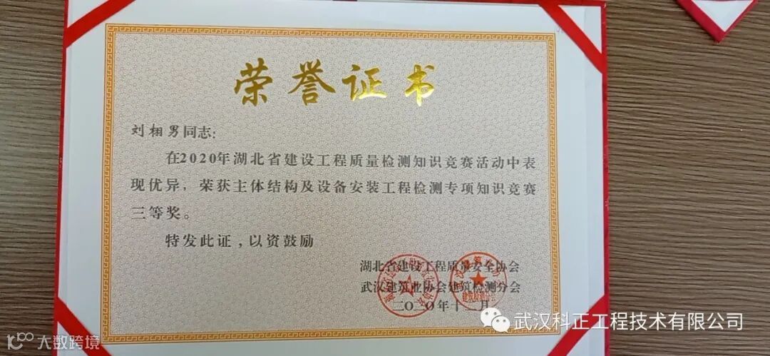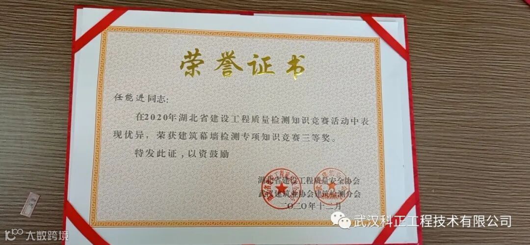 武汉科正工程技术有限公司在湖北省建设工程质量安全协会于11月举办的“2020年度,建设工程质量检测知识竞赛”中,我司不仅荣获2020年湖北省建设工程质量检测知识竞赛优秀组织单位。且公司员工刘栩男、任能进、詹亚群更是凭借表现优异,荣获了此次大赛的三等奖,特此祝贺!
