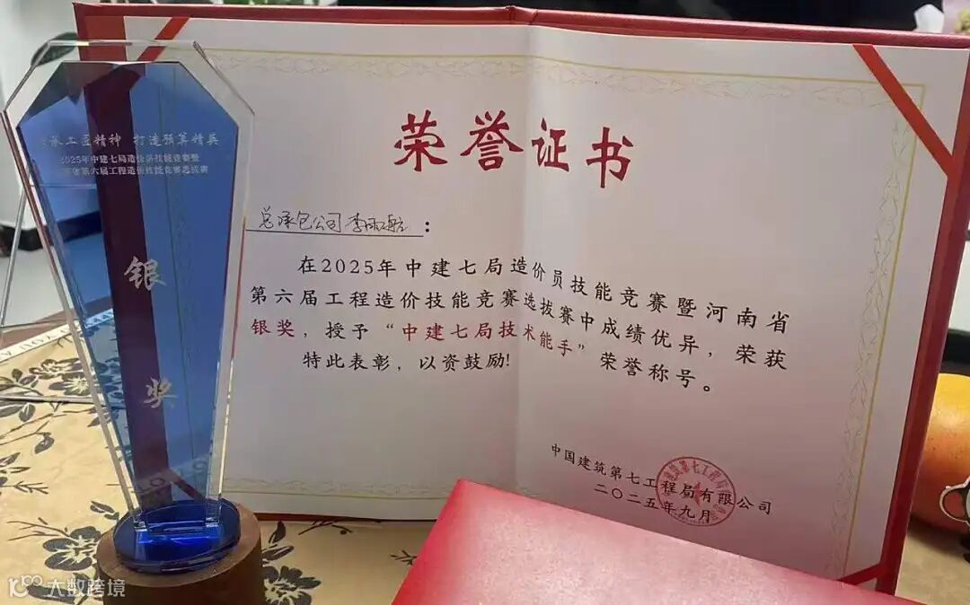 根深才能叶茂,本固方可枝荣。脚踏实地、步履坚实成为他不断完成新挑战的根基。在2025年中建七局造价员竞赛暨河南省第六届工程造价选拔赛中,他凭借优异表现斩获全局第二,积淀了扎实的赛事经验。