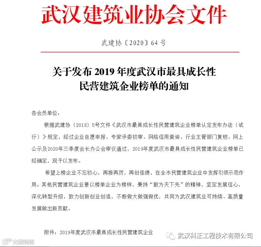 热烈祝贺武汉科正获得2019年度武汉市最具成长性民营建筑企业