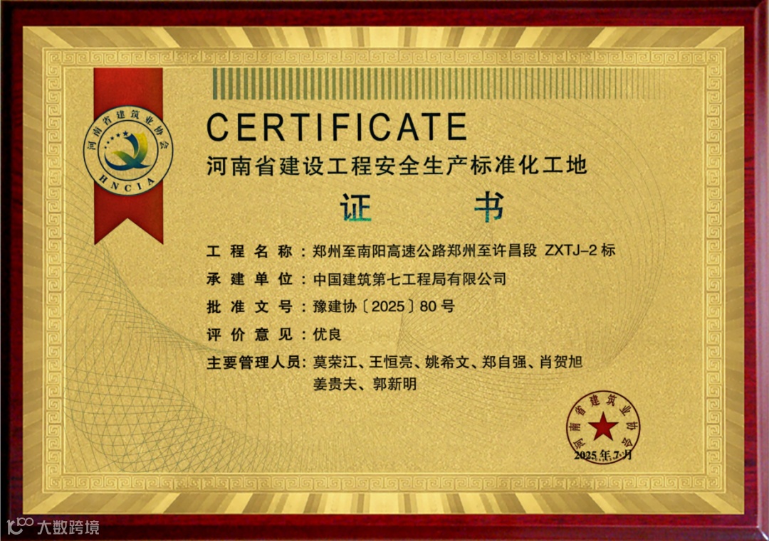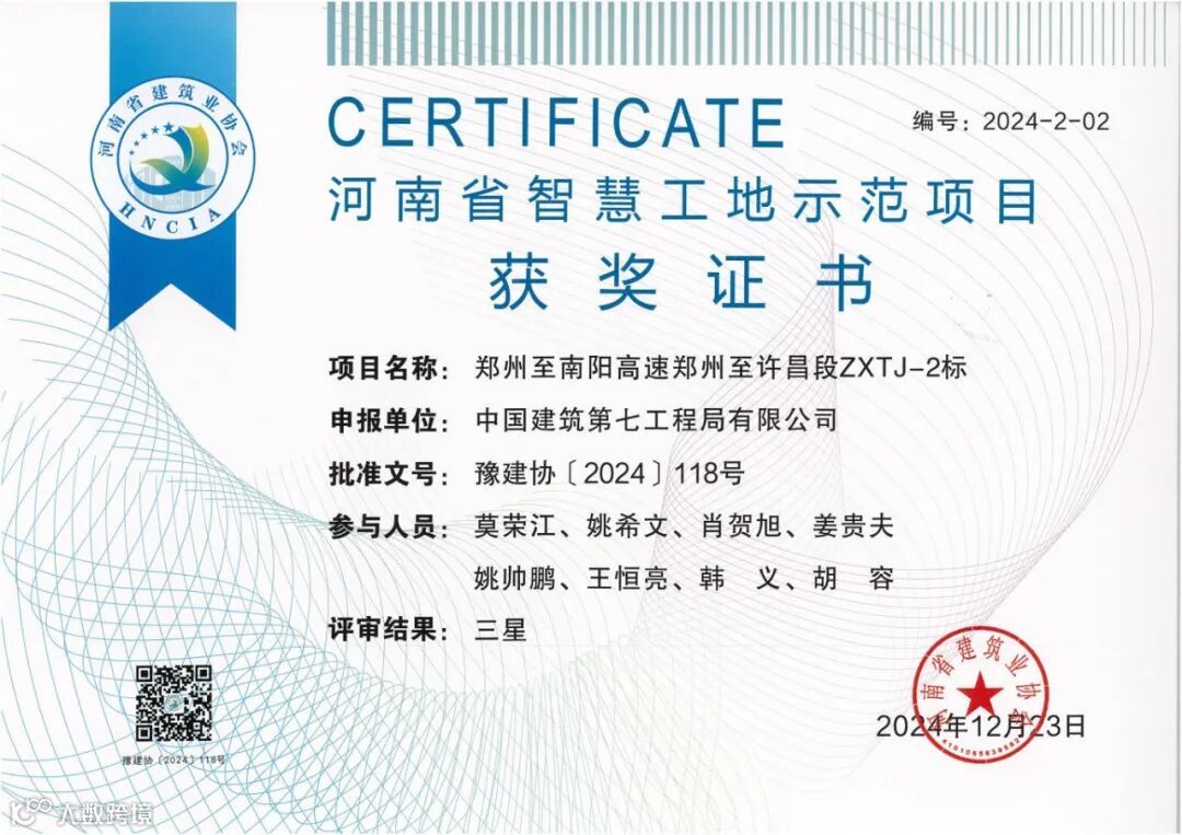 为提升安全管理成效,项目部不仅在管理创新、安全教育等“软件”上下功夫,还引入“黑科技”,通过在跨路顶推等高风险作业区域设置全天候监控“三重物理+科技防护网”,进一步提升安全防护水平,守牢“零隐患、零事故”底线。2025年7月,项目部荣获“河南省安全文明施工标准化工地”称号,持续为工程建设保驾护航。