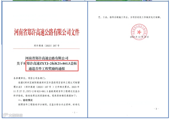 牢固树立过程精品理念,在路基施工中采用“大超宽+缓刷坡+早防护”的砂性土路基防冲刷工艺组合,获业主全线推广并组织观摩学习;在涵洞施工中通过模板组合创新,实现混凝土外观“质的飞跃”,其中K21+861.5涵洞施工质量赢得业主高度认可,获评样板工程,累计获质量奖金百万余元。