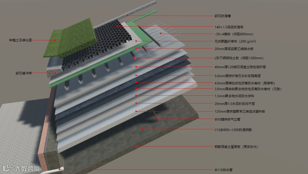 党支部迅速成立党员先锋队,项目经理带头扎根现场,白天测坡度、调模板角度,晚上围着图纸优化抗滑移方案,连续一周蹲守在屋面浇筑现场,紧盯混凝土坍落度、振捣密度,确保每一寸结构都牢固可靠。针对陡坡种植难题,他带领技术人员反复试验,最终采用屋面预留抗滑钢筋与挡土板、扁钢拉接带、防滑格形成的复合防滑体系,既保证透水性、又防冲刷,让绿植在陡坡上稳稳“安家”。