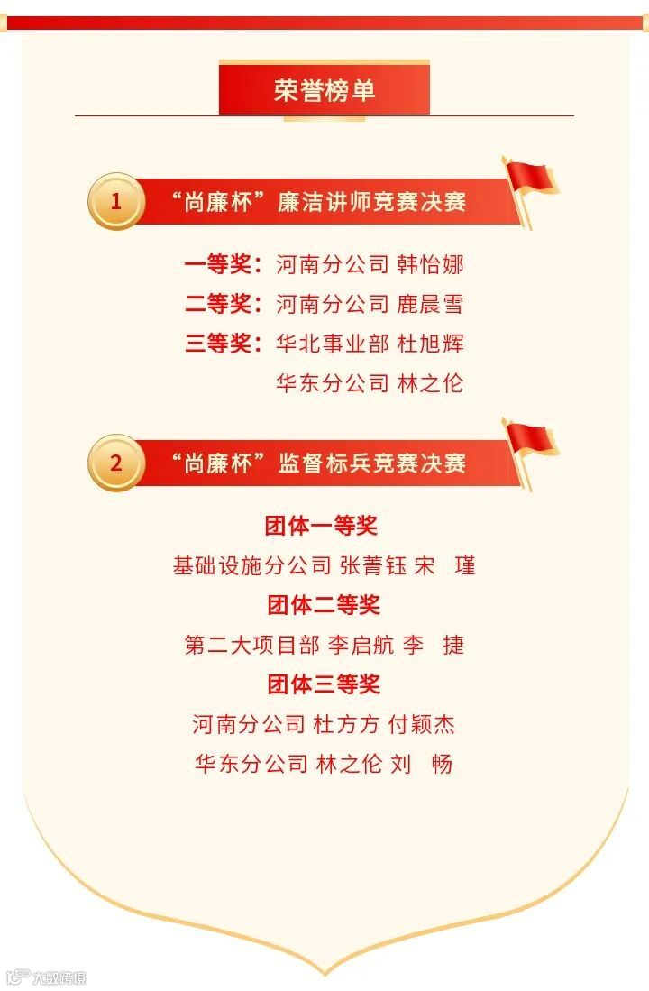 经过激烈角逐,大赛评出了一、二、三等奖,其中河南分公司韩怡娜荣获“廉洁讲师”竞赛一等奖、基础设施分公司清风护航队荣获“监督标兵”竞赛团体一等奖;中欧班列项目部荣获优秀组织奖。