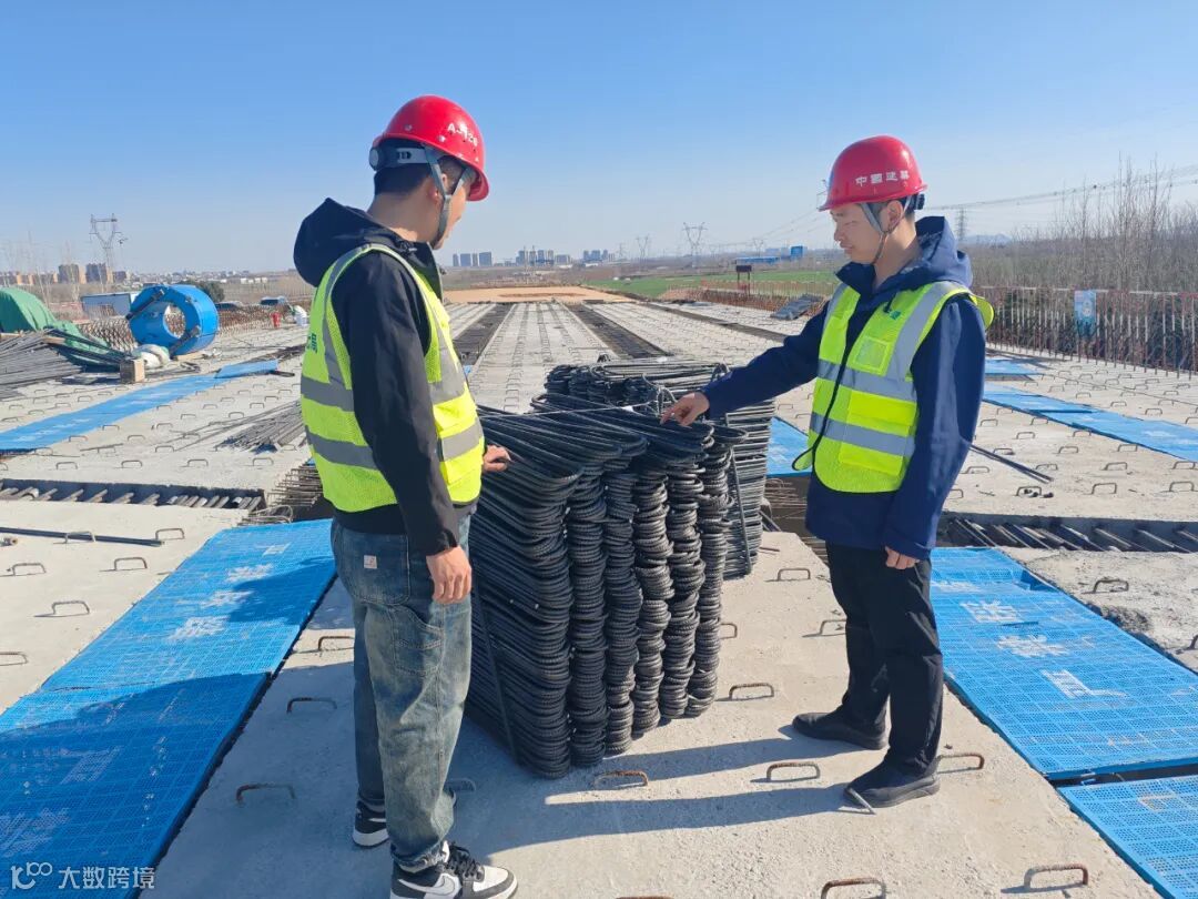 ▲姚帅鹏(右)与同事检查现场桥面系钢筋施工质量