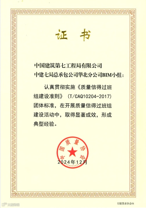 华北事业部BIM小组获评中国质量协会“质量信得过班组”。