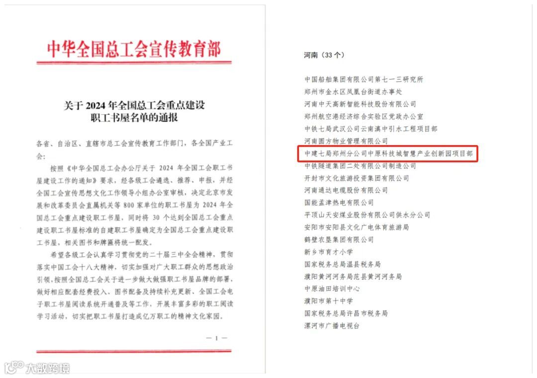 中原科技城智慧产业创新园项目部获评2024年“全国总工会重点建设职工书屋”。
