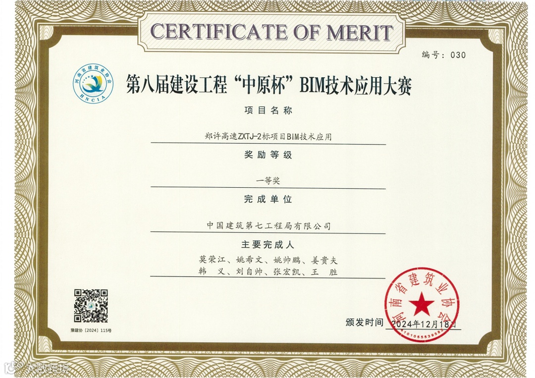 基础设施分公司申报的《郑许高速ZXTJ-2标项目BIM技术应用》获评第八届建设工程“中原杯”BIM技术应用大赛“一等奖”。