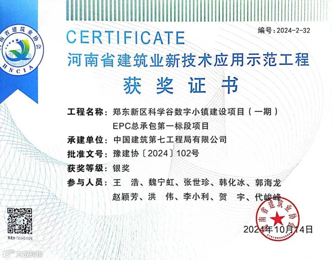 郑东新区科学谷数字小镇建设项目获评“河南省建筑业新技术应用示范工程”。