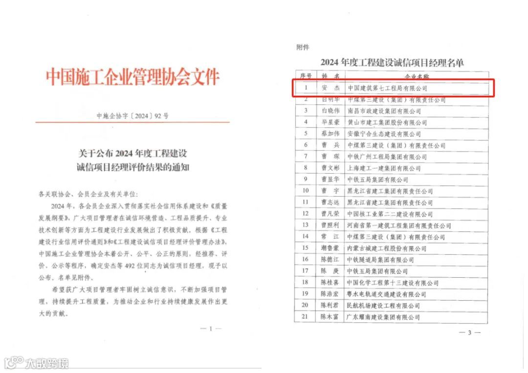 中原科技城人才创业园项目经理安杰荣获中国施工企业管理协会2024年度工程建设“诚信项目经理”称号。