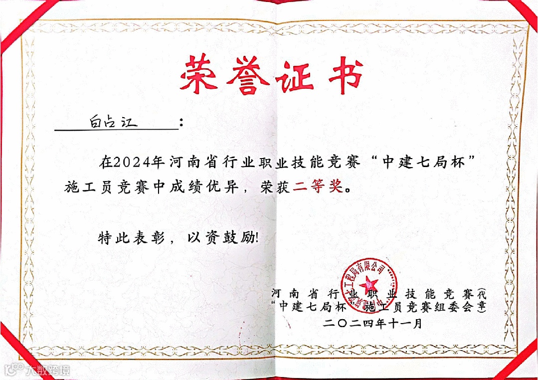 在2024年河南省行业职业技能竞赛“中建七局杯”施工员竞赛中,公司员工白占江、安定乾、陈玉恒3人获得个人二等奖,刘胜强获得个人三等奖。