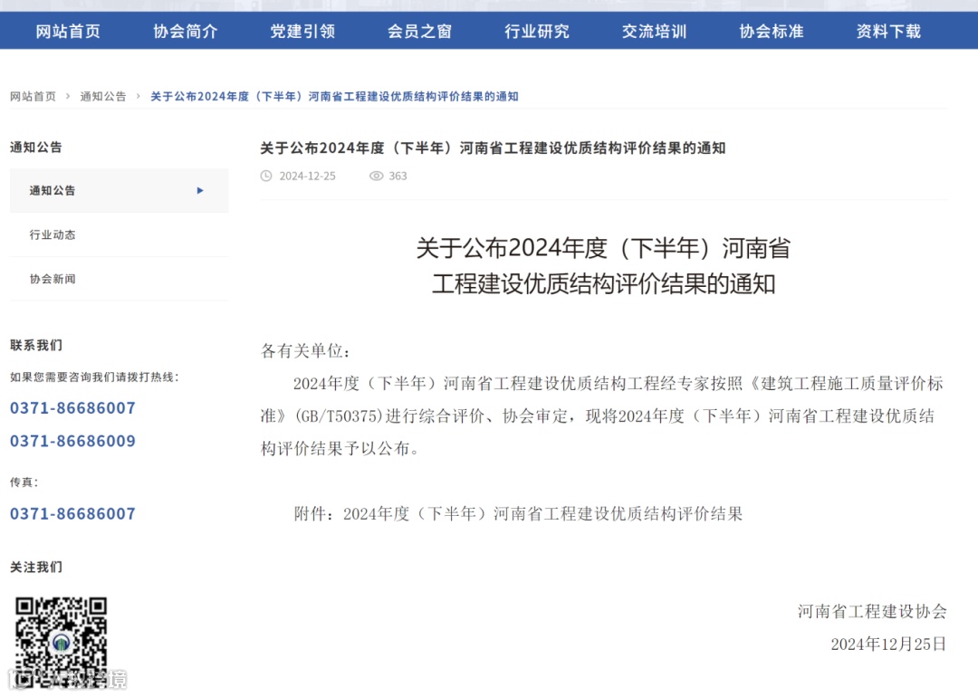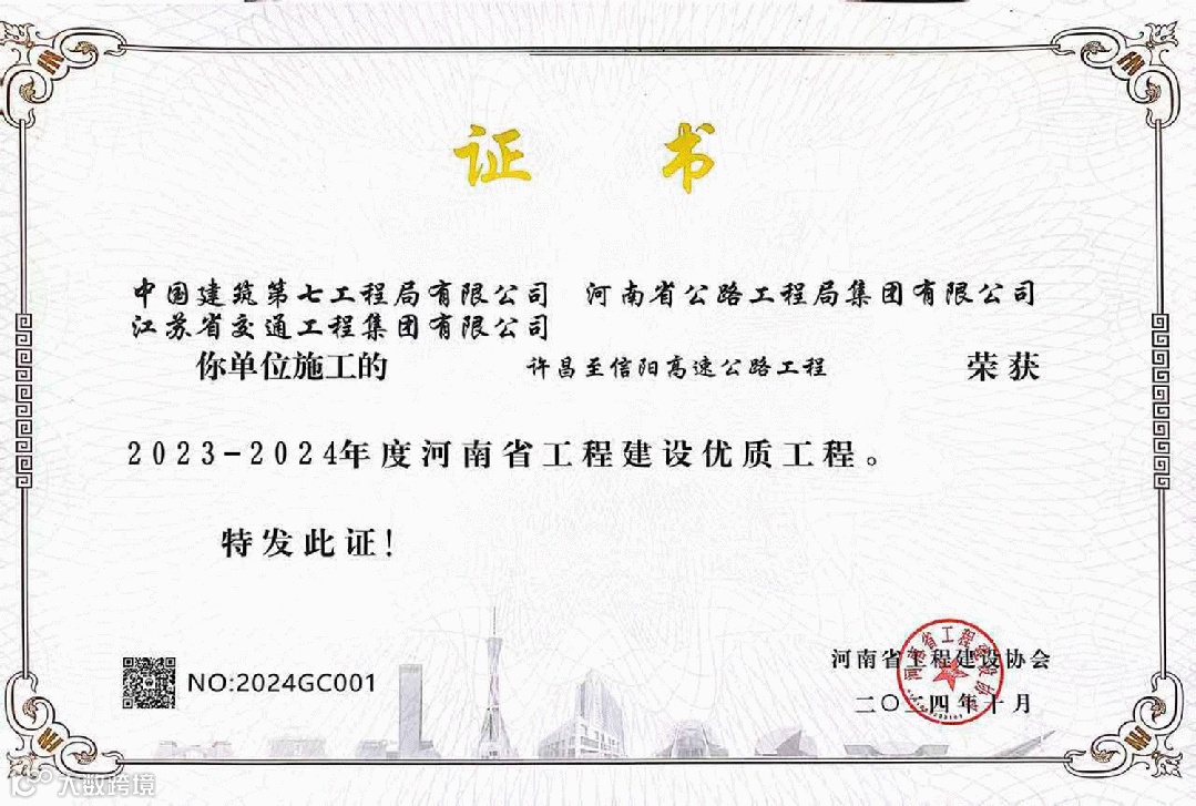 许信高速公路项目、科学谷前程路跨云溪桥梁工程、中国电信郑州航空港数据中心一期项目获评“2023-2024年度河南省工程建设优质工程”。