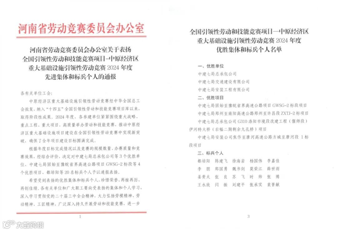 在河南省劳动竞赛委员会组织的全国引领性劳动和技能竞赛项目——中原经济区重大基础设施引领性劳动竞赛2024年度先进集体和个人表彰中,总承包公司获“优胜单位”称号,固皖高速、郑许高速、洛阳九孔桥项目获“优胜项目”称号,都培阳等14名公司员工获“标兵个人”称号。