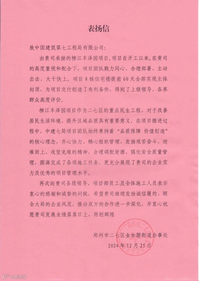 柳江丰泽园等项目积极践行“砺进·共赢——承之道”企业文化,在完美履约、服务社会等方面成绩突出,收到来自属地政府、主管部门、业主单位的表扬信、感谢信、锦旗等20余封(幅)。