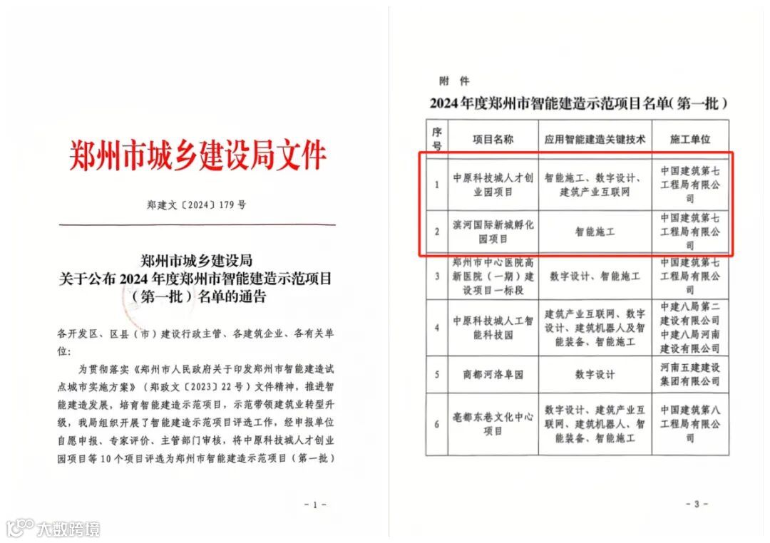 中原科技城人才创业园项目、滨河国际新城孵化园区项目获评2024年度“郑州市智能建造示范项目”。