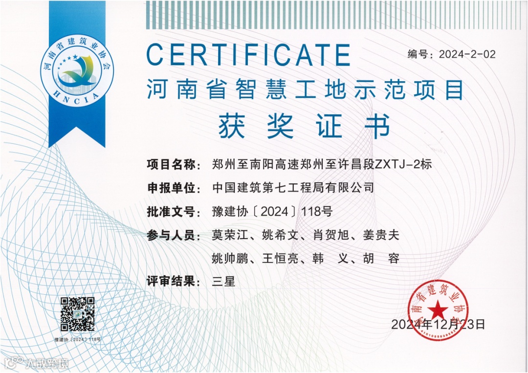 郑许高速项目获评“2024年第二批河南省智慧工地示范项目”。
