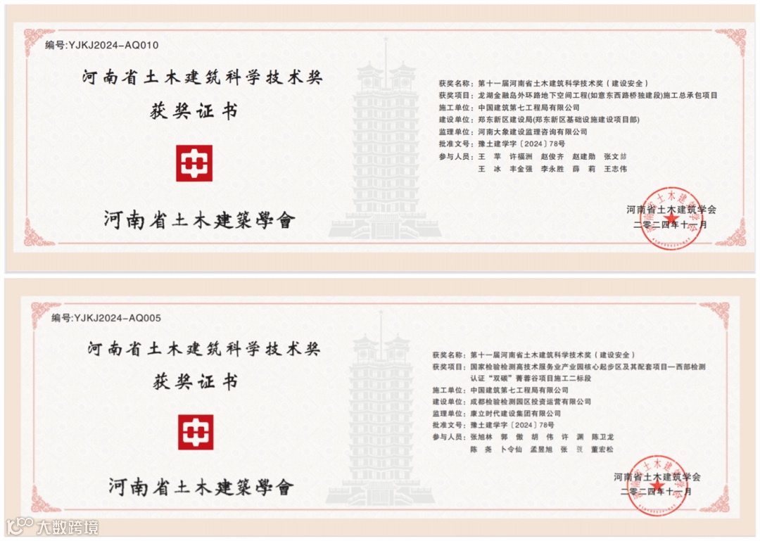 金融岛地下空间项目、西部检测认证“双碳”菁蓉谷项目获评“第十一届河南省土木建筑科学技术奖(建设安全)”。