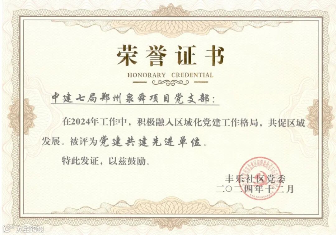 郑州泉舜项目党支部被项目所在地郑州市金水区丰乐社区党委评为“党建共建先进单位”。