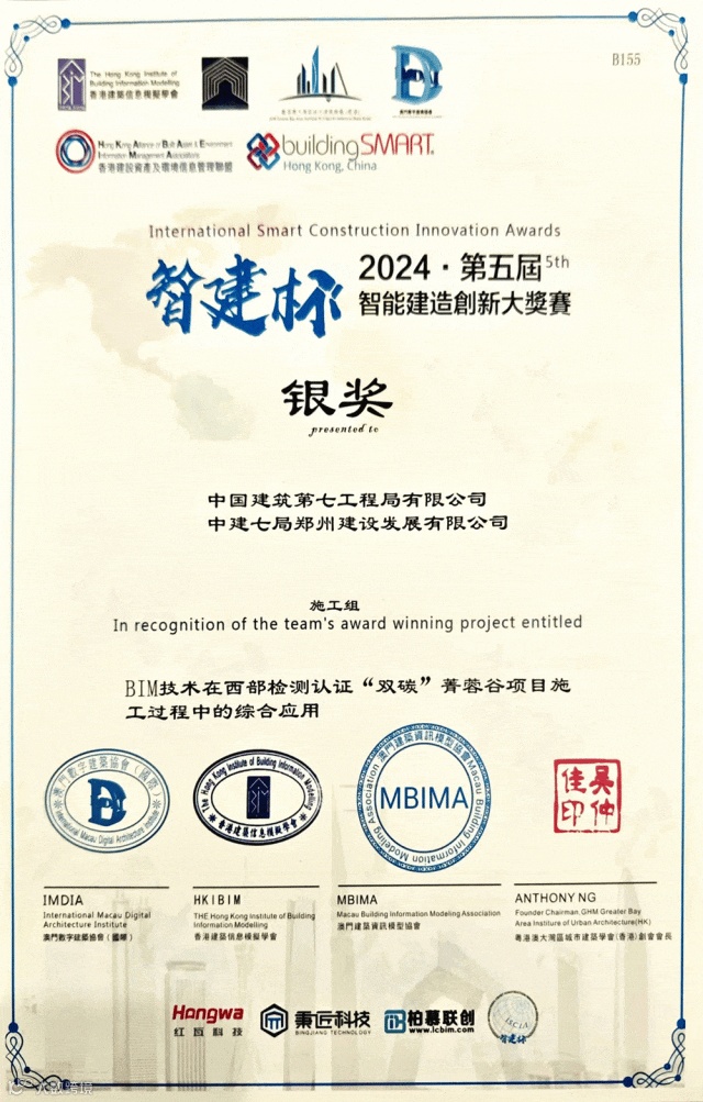 公司申报的《BIM技术在西部检测认证“双碳”菁蓉谷项目施工过程中的综合应用》成果获2024智建杯银奖(国际级),第四届新基建杯二等奖、金标杯三等奖(国家级),匠心杯一等奖、中原杯二等奖、第一届住房城乡建设部智能建造工程技术创新中心智能建造大赛二等奖(省部级)等荣誉。