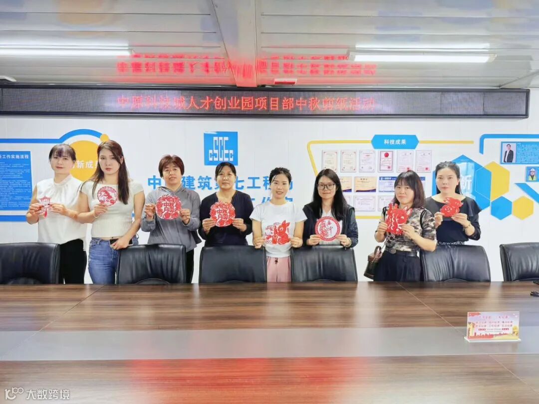 我是中原科技城人才创业园项目部的姜巧梅(图中左五)。今年中秋我们项目开展了富有传统文化特色的剪纸活动。活动当天,项目部会议室布置得温馨而喜庆,桌上摆放着各式各样的剪纸工具和材料。我们拿起剪刀,小心翼翼地折叠纸张,然后一刀一刀地剪出精美的图案。剪纸作品完成后,大家纷纷展示自己的作品,互相欣赏,合影留念。看到大家热情互动、其乐融融,作为活动筹办组的一员,我更是感到无比开心。