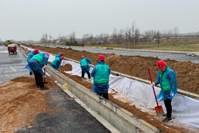 3月14日,固皖高速项目组织干部职工成立党员突击队,与劳务工友一起冒雨抢工,为沥青铺设和绿化尽早施工提供工作面。