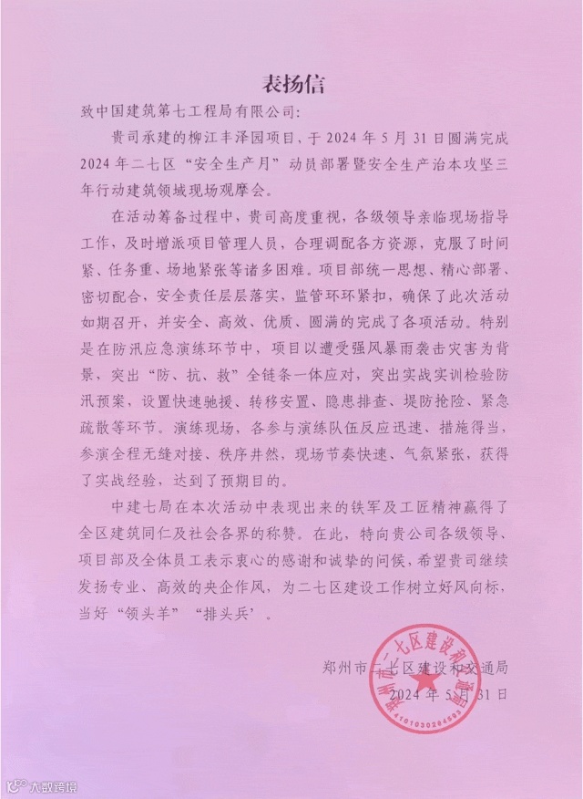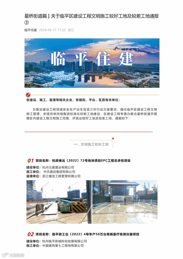 因安全文明施工、现场管理、优质履约等工作成绩突出,杭州临平项目多次获得临平区住建局通报表扬,并获业主表扬信一封。