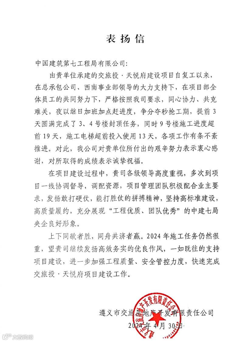 遵义天悦府项目优质履约获业主表扬信一封。