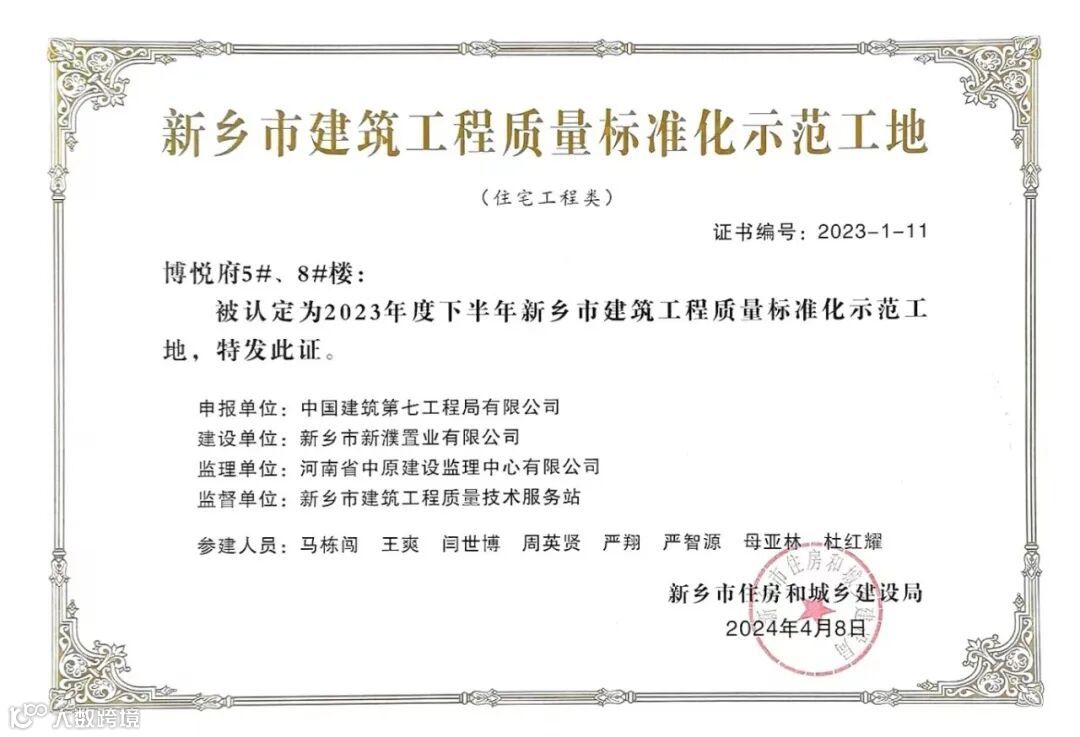 新乡区域项目二期5号楼、8号楼获评新乡市工程质量标准化示范工地。