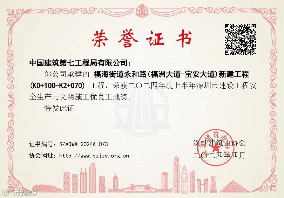 福海街道永和路项目获评“深圳市建设工程安全生产与文明优良工地奖”。