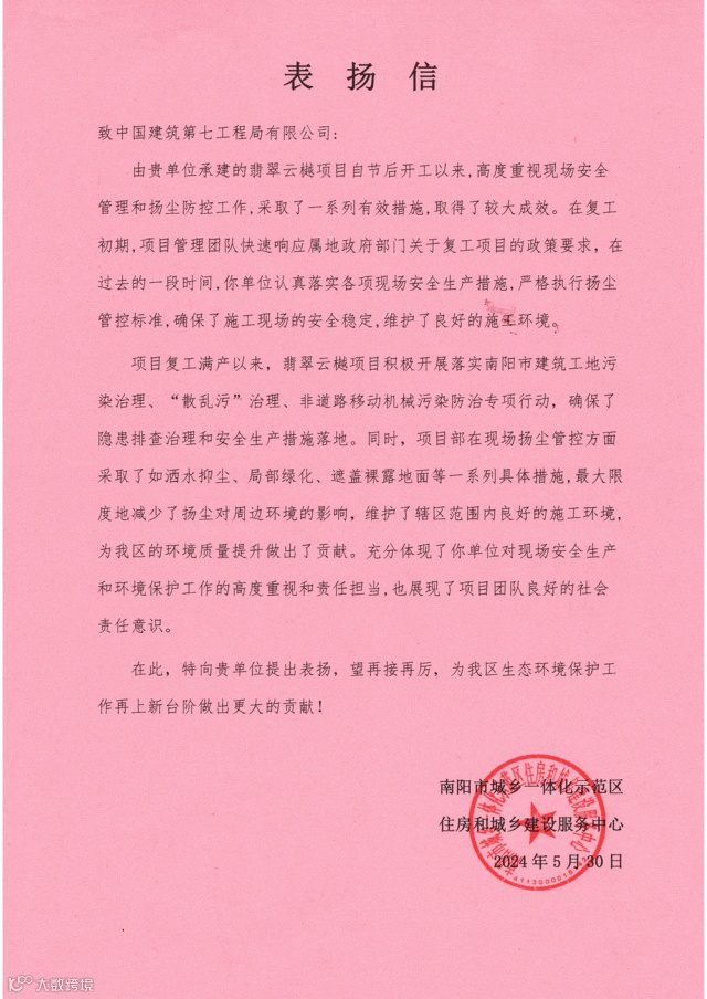 南阳区域两项目优质履约获主管部门及业主单位分别致信表扬。