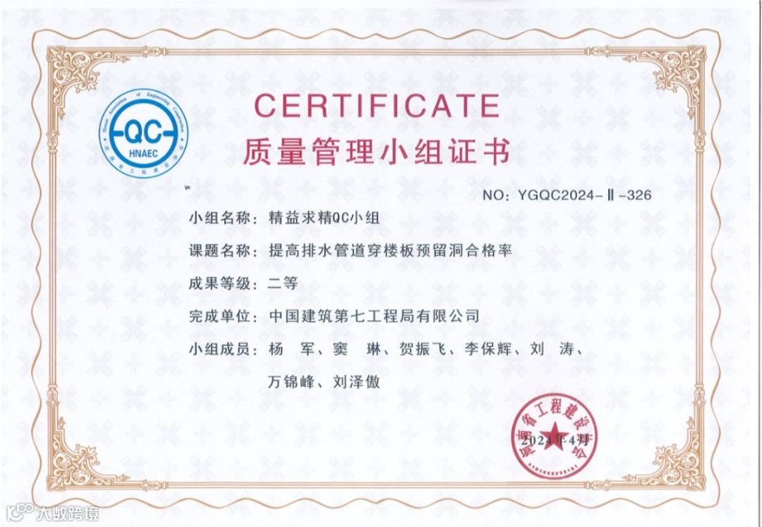 分公司QC成果《提高排水管道穿楼板预留洞合格率》获评河南省工程建设协会二等成果。