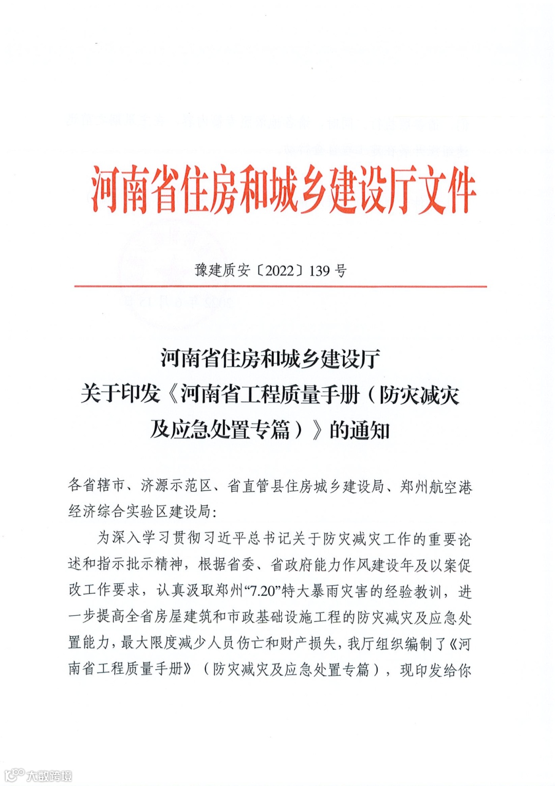 《河南省工程质量手册(防灾减灾及应急处置专篇)》印发