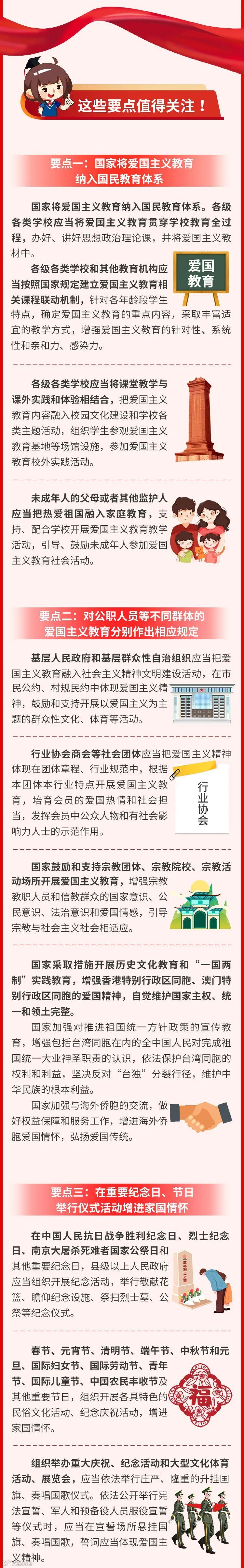 爱国主义是中华民族绵延不绝最重要的精神基因,是中华文明源远流长最宝贵的精神财富,也是中国人民团结奋进最强大的精神动力。为了加强新时代爱国主义教育,传承和弘扬爱国主义精神,凝聚全面建设社会主义现代化国家、全面推进中华民族伟大复兴的磅礴力量,2023年10月24日,第十四届全国人民代表大会常务委员会第六次会议通过《中华人民共和国爱国主义教育法》,自2024年1月1日起施行。