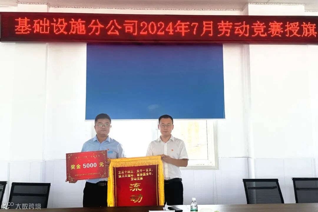 8月7日,分公司党总支副书记、工会主席杨国伟为睢县九湖连通项目颁发分公司7月份劳动竞赛流动红旗。