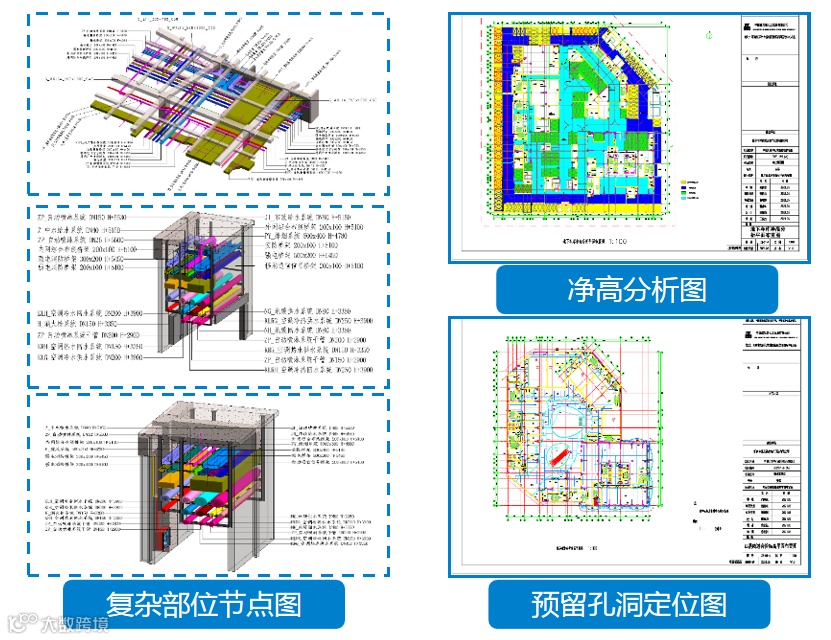 在施工前期进行管线综合深化设计、净高分析、预留洞口深化。发现图纸错误73处,方案优化36处,二次深化10处,净高图共46张,预控孔洞施工图共25张。