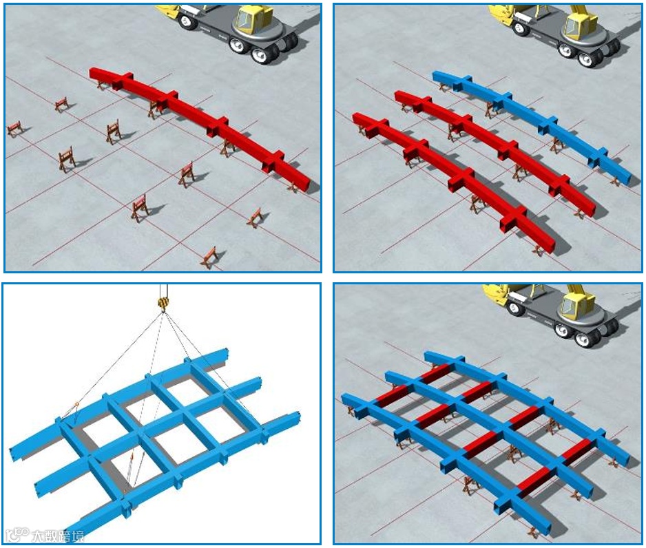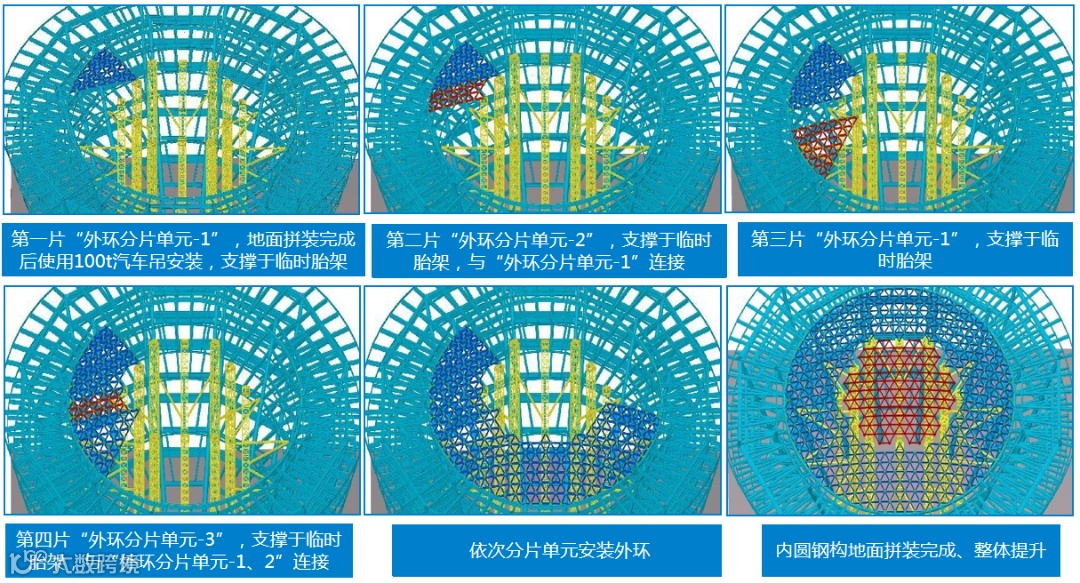 通过对施工阶段的结构进行受力分析和性能计算,选择合适的施工方法,解决场地狭小的问题。采用优化后的施工方案,使钢桁架的分段吊装、胎架上拼装、焊接、测量校正、油漆等工序在同一胎架上重复进行,提高安装质量,改善施工操作条件,增加施工安全性。