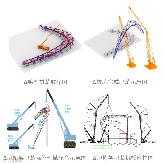 项目技术团队通过对施工阶段的结构进行受力分析和性能计算,采用每单榀径向主桁架整体吊装,单榀设置“内-外”两道临时支撑体系的施工技术,解决场地狭小的问题。通过优化施工方案,使桁架装配的大部分工作可在地面完成,拼装、焊接、测量校正、上漆等工序在同一胎架上重复进行即可,提高了安装质效,改善了施工操作条件,提升了施工安全性。
