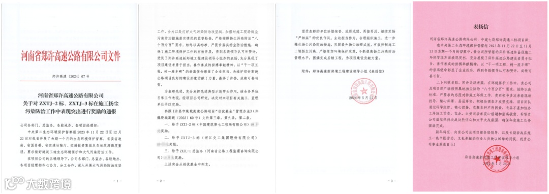 因施工扬尘污染防治工作措施得当、效果显著,项目得到各级领导的肯定,获郑许高速项目公司通报表扬及专项奖励。