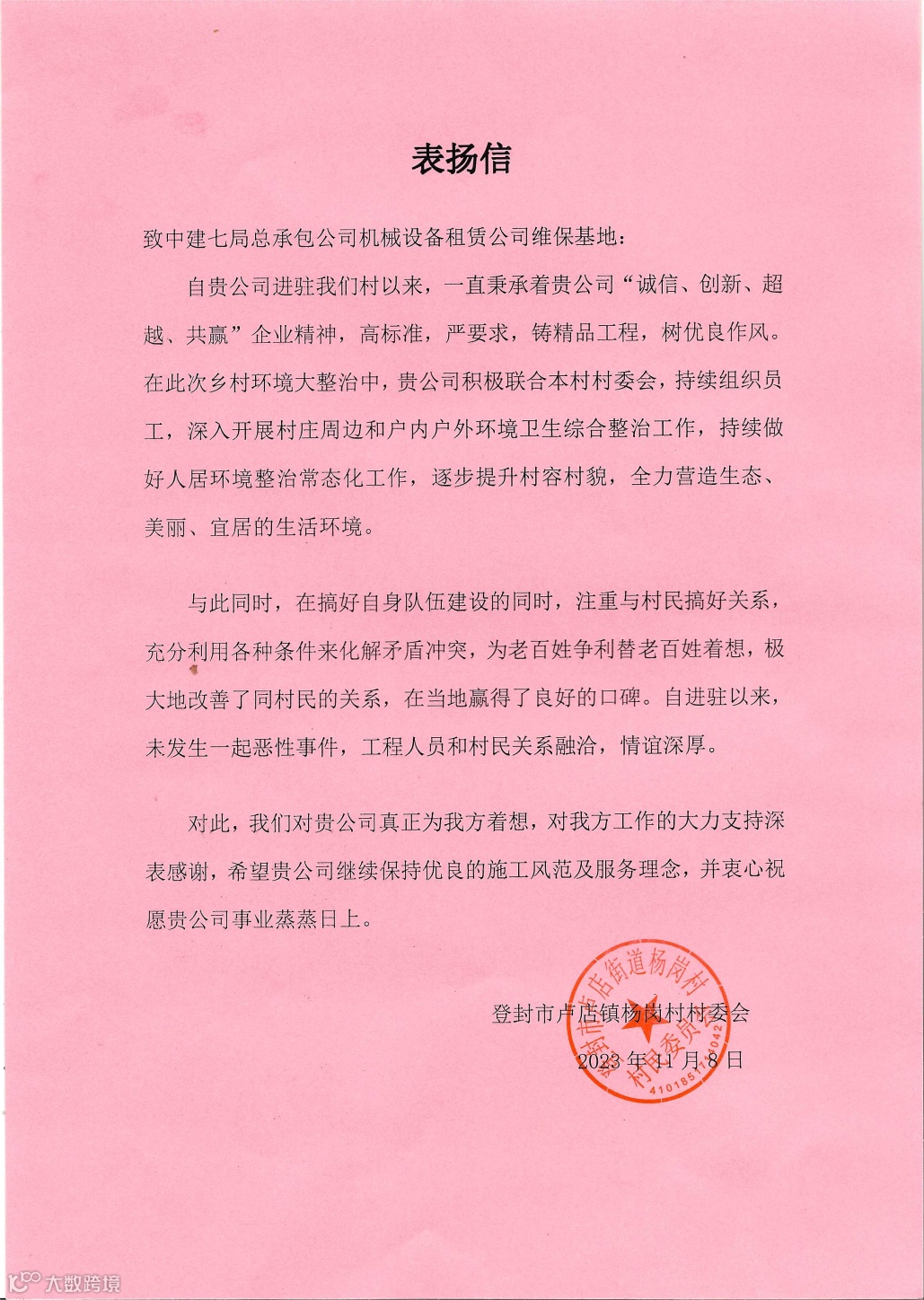 因持续组织员工深入开展村庄周边和户内户外环境卫生综合整治工作,11月8日,分公司维保基地收到登封市卢店镇杨岗村村委会表扬信。