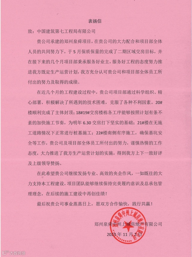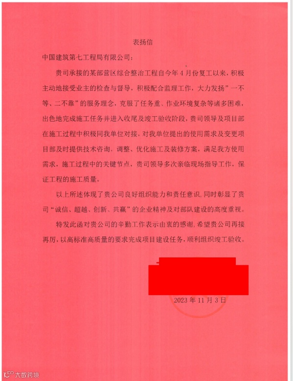 近日,分公司某部代建项目朝阳区域荣获业主表扬信一封。