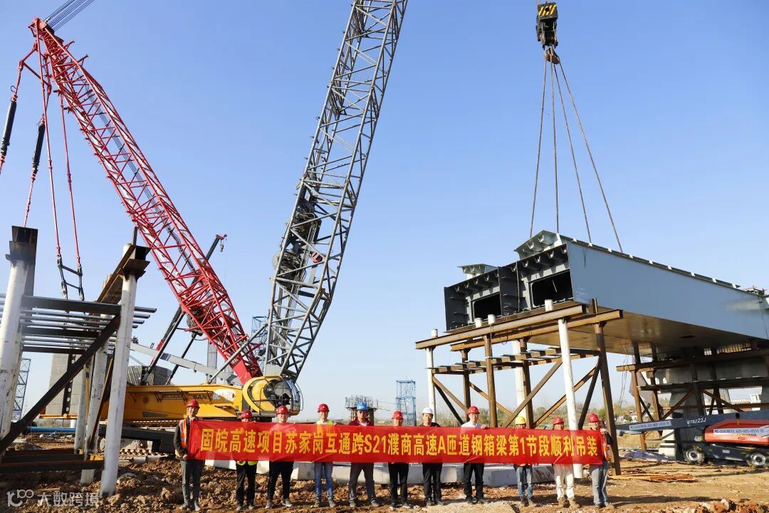 11月7日,分公司固皖高速项目苏家岗互通立交首节钢箱梁成功架设。
