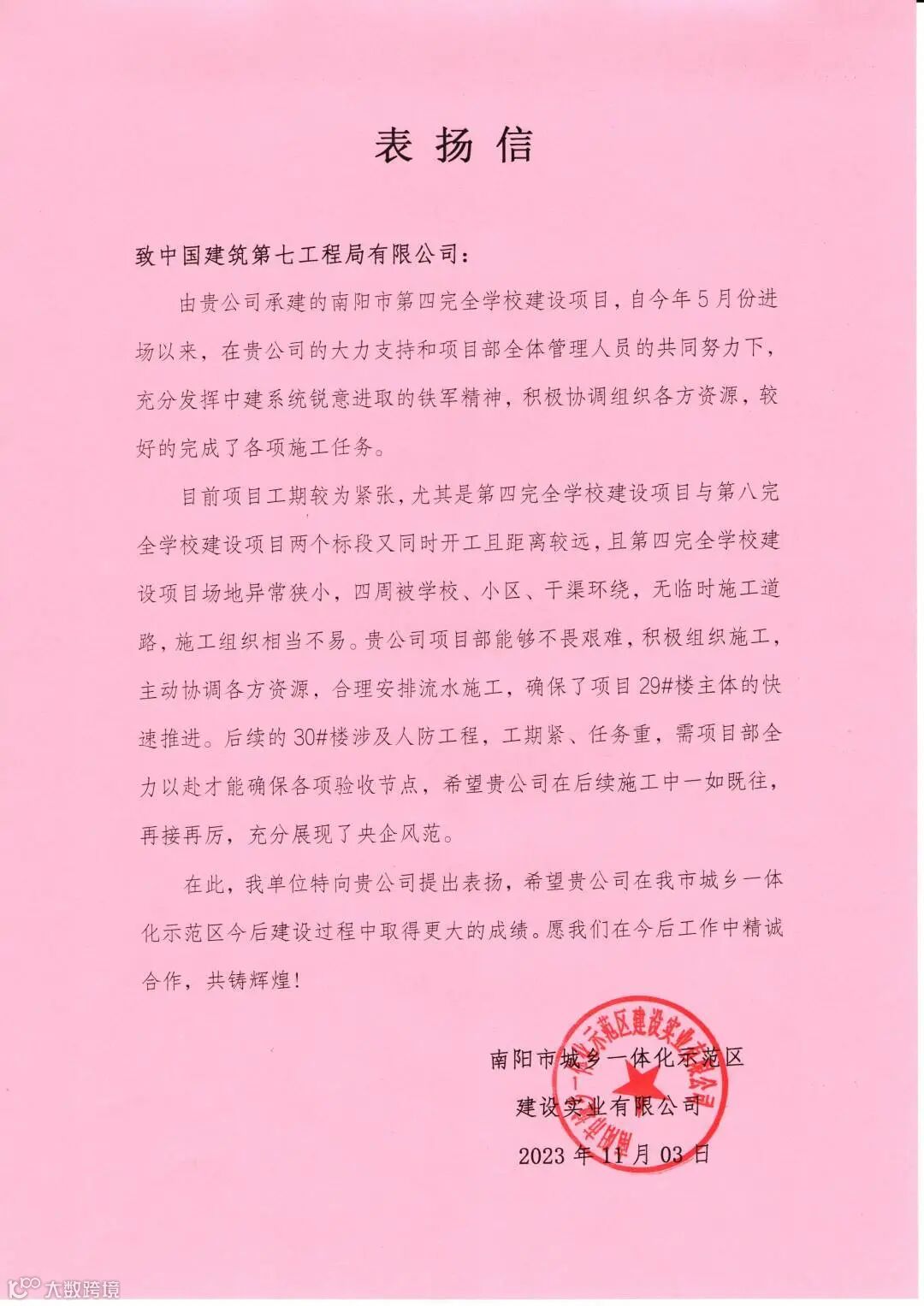 近日,分公司南阳市第四、第八完全学校保障性租赁住房建设项目获业主单位表扬信两封。