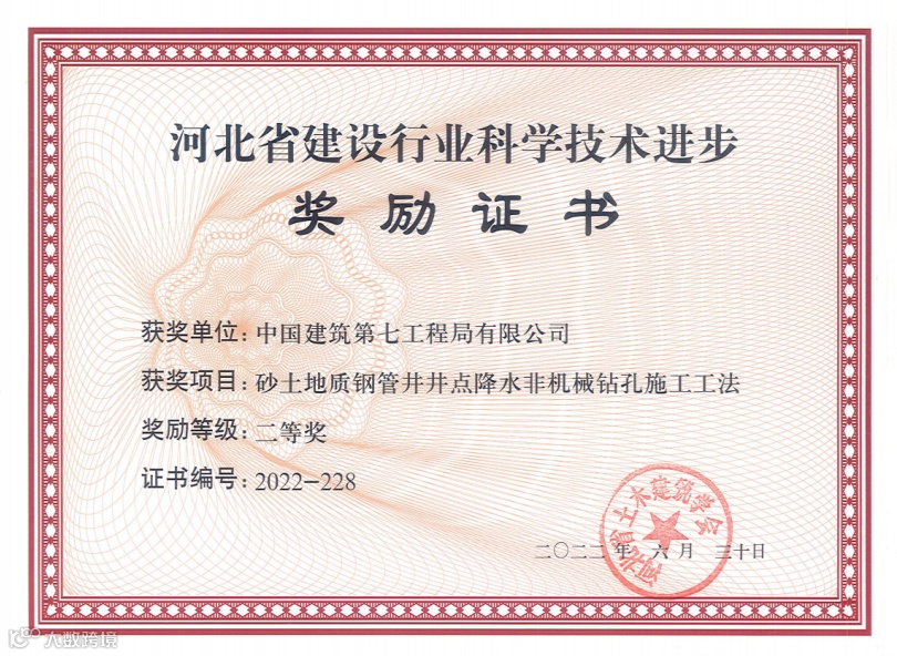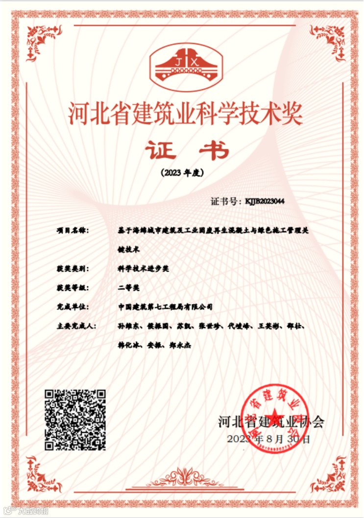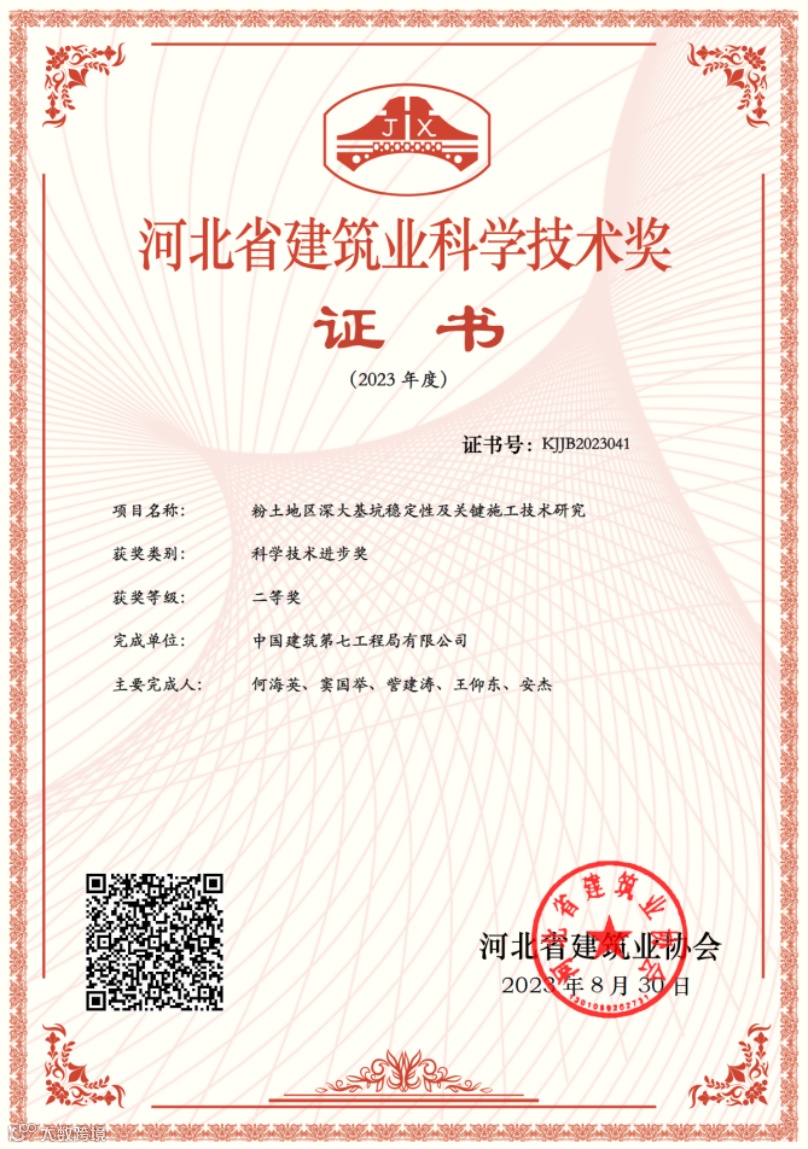 日前,河北省建筑业协会公布《关于表彰2023年度河北省建筑业协会科学技术奖的决定》,公司4项成果获评科学技术进步奖二等奖,实现公司在河南省外科技成果创优新突破。