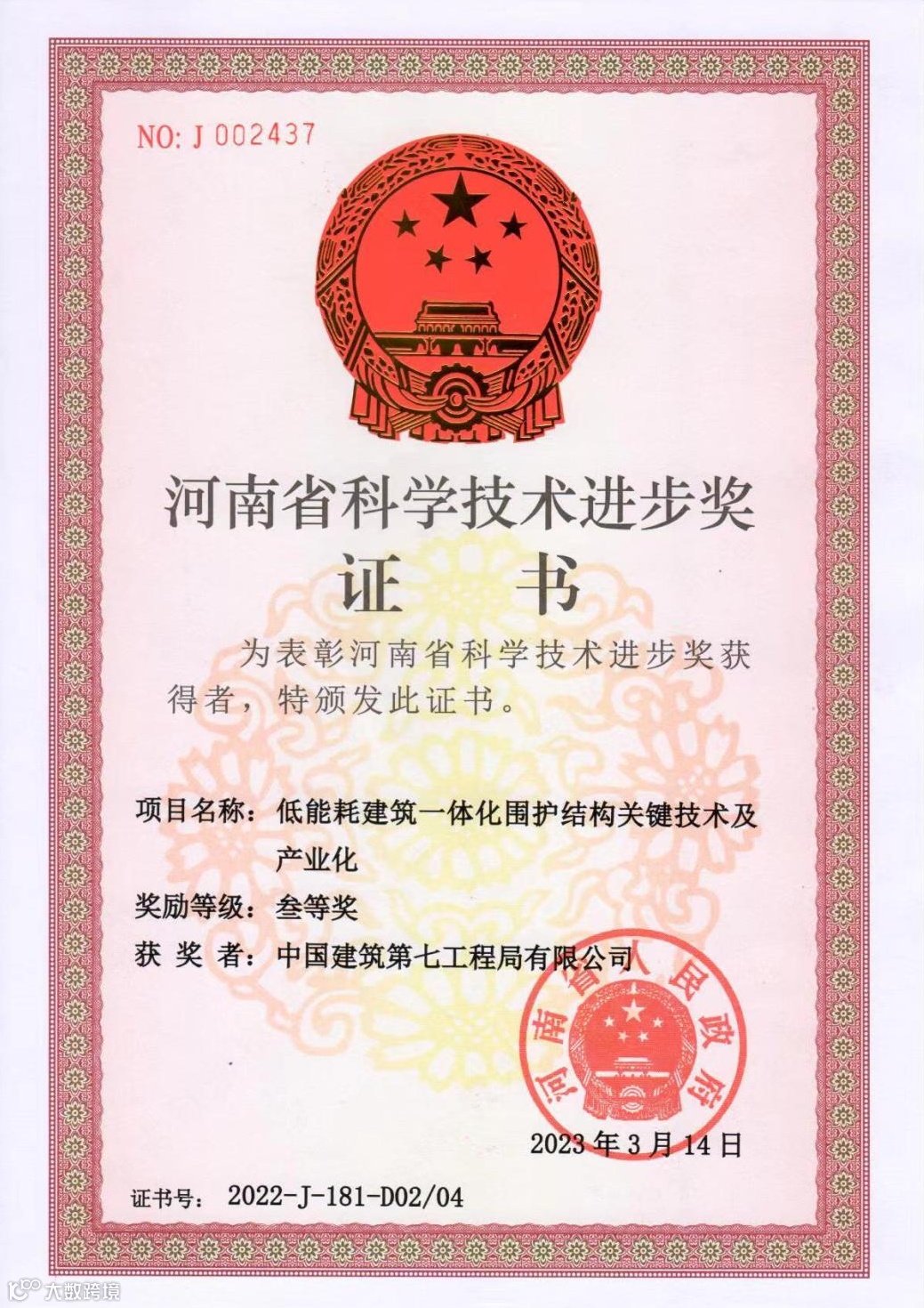 该成果被认定达到国际领先水平,获河南省科学技术进步奖三等奖。该成果创新了差速法混凝土浇筑等施工工艺,编制了《内置保温现浇混凝土复合剪力墙技术标准》行业标准,填补了相关领域的空白,开发了预制保温外墙免支模一体化技术,提高了施工工效,经济、社会、环境效益显著。