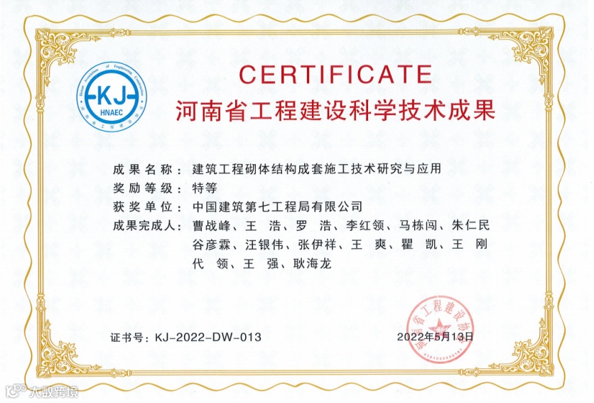 该成果被认定达到国内先进水平,获河南省工程建设科学技术成果特等奖。该成果研发了砌体拉结筋预埋施工技术,解决了木模板上留孔安装构造中的模板补孔量及加固量大、钢筋不易固定的问题,工程应用效果明显,社会经济效益良好。