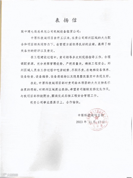近日,分公司郑州区域先后收到三封表扬信,信中对分公司在设备管理服务过程中严格抓好安全管理、坚持定期开展设备检查等工作表示高度赞扬。