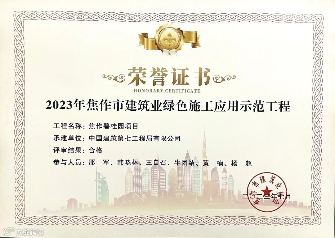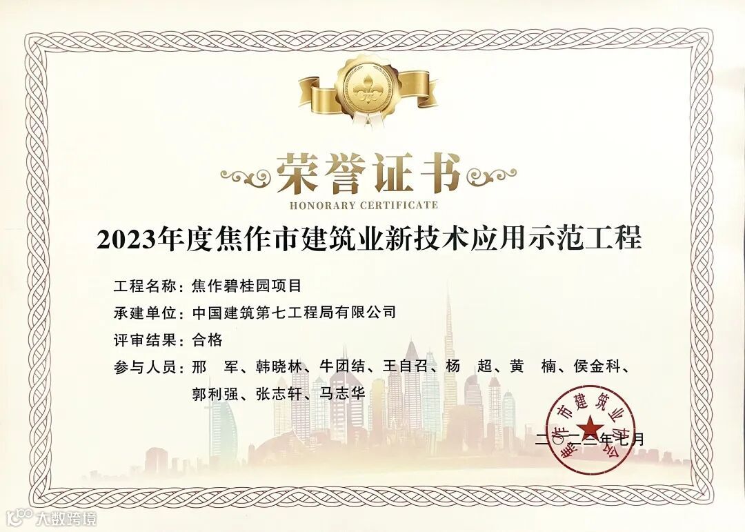 7月10日,郑州分公司焦作项目获评“2023年度焦作市建筑业新技术应用示范工程”“2023年焦作市建筑业绿色施工应用示范工程”。